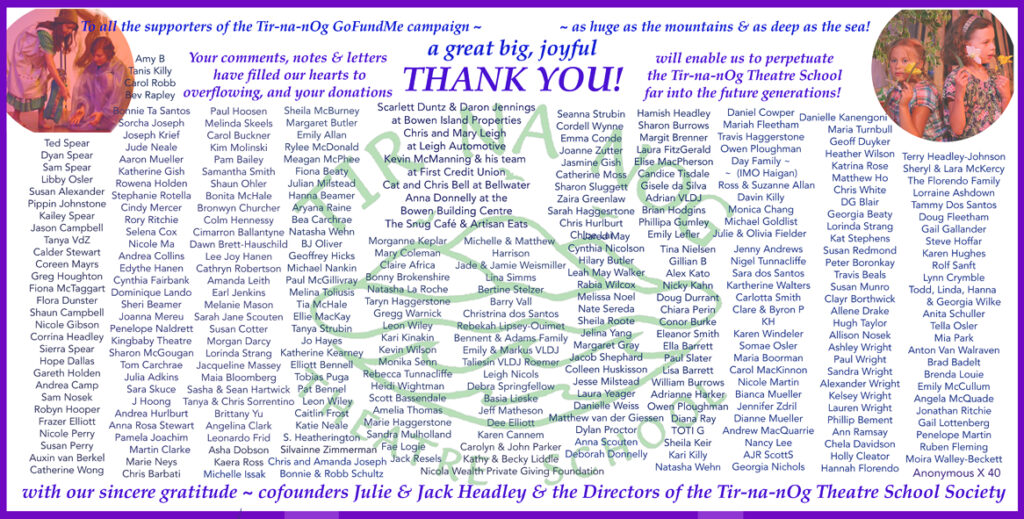 The Tir-na-nOg Theatre School Society appreciates the support of granting organizations and individual donors within the Bowen Island Community and beyond. Our heartfelt thanks!